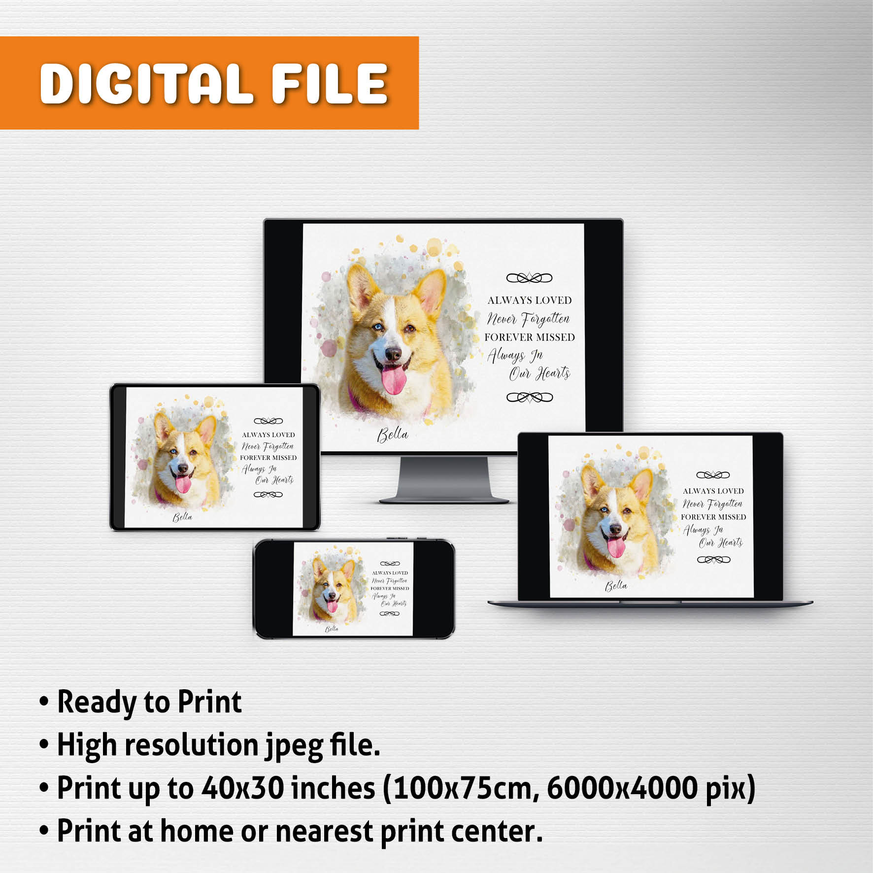 - If you ordered a “Digital File”, Your order will be sent to your email address. You will receive a high-resolution, printable 300dpi JPEG file.